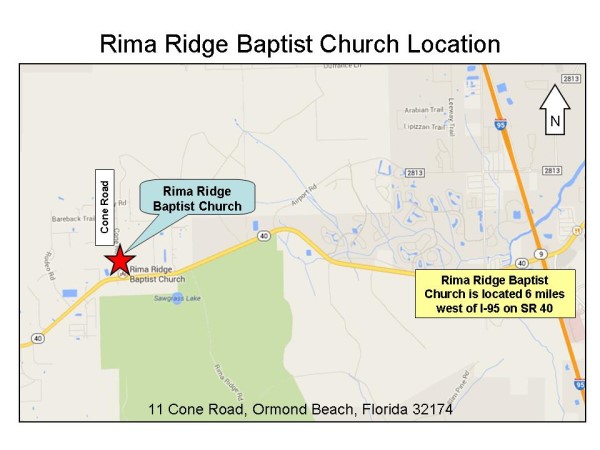 From North of Ormond Beach: Travel on Interstate 95 Southbound to Exit 268. Exit 268 to State Road 40 Westbound. Travel westbound on State Road 40 for approximately 6 miles and the church is located on the corner of SR 40 and Cone Road.